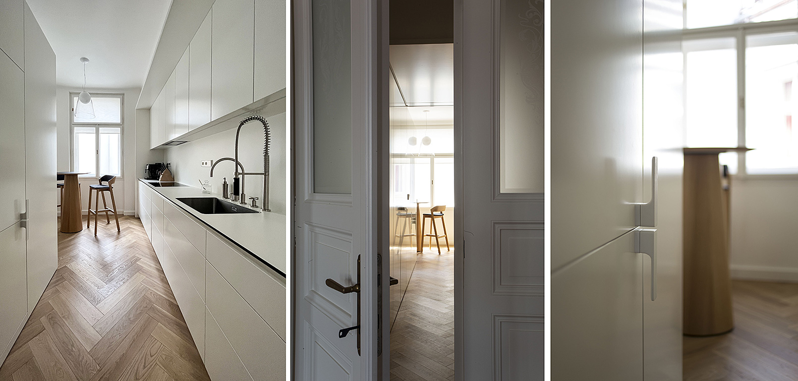 The original layout consisting of several small apartments with a kitchen facing the courtyard, a shared common area, and a narrow central hallway with a wooden porch was doomed to be dilapidated. The adaptation into a single apartment allowed us to combine comfortable use with the restoration of the original character of the space, amidst the sea of red roofs in the vicinity of Old Town Square.