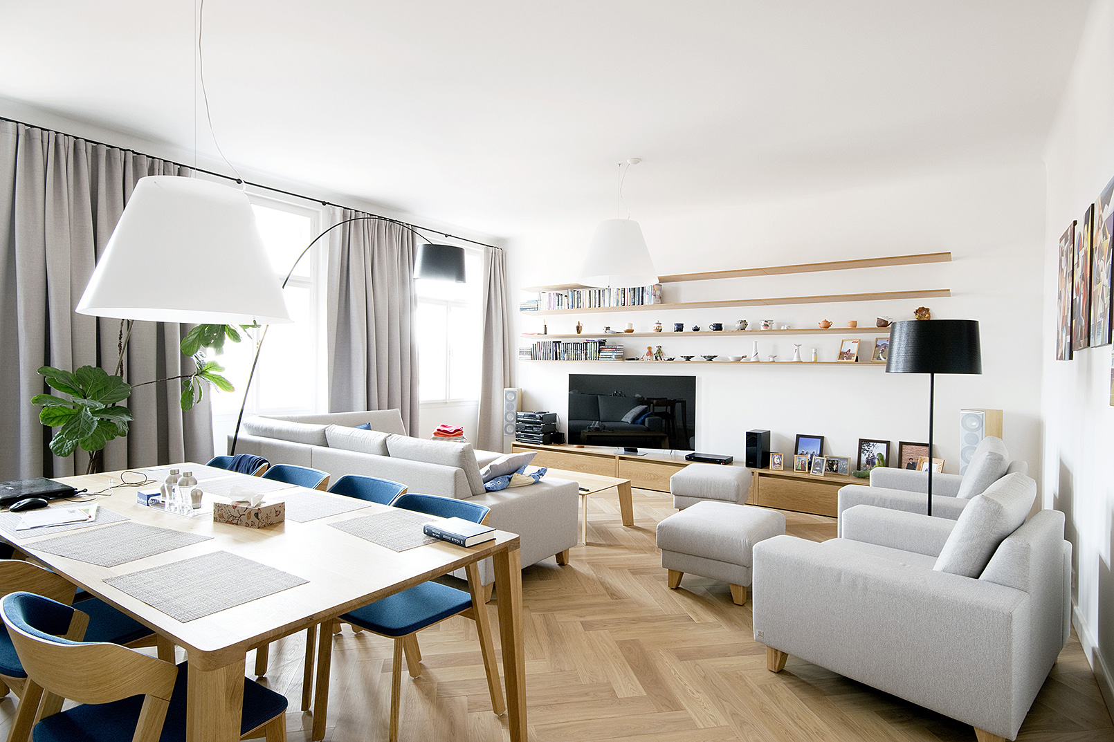 The adapted apartmentt with a day area and four bedrooms is built along the central hallway based on a hierarchically zoned layout. The day area with the main room and a kitchen facing the courtyard is closest to the entrance. The kitchen, as it used to be, a separate room, but the link with the main room is strengthened to the extent that it doesn’t functionally separate the space.