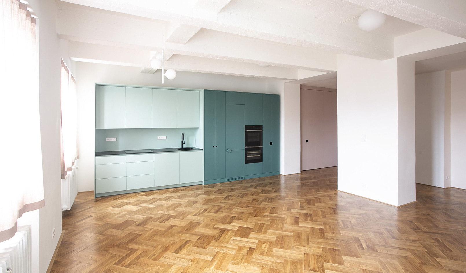 Cílem úprav bytu z roku 1955 bylo vytvořit vhodné univerzální dispoziční a interiérové řešení pro pražský podnájemní byt. Navržené řešení se vyznačuje otevřením obytného prostoru, zvýšením komfortu a maximalizací úložných kapacit.
