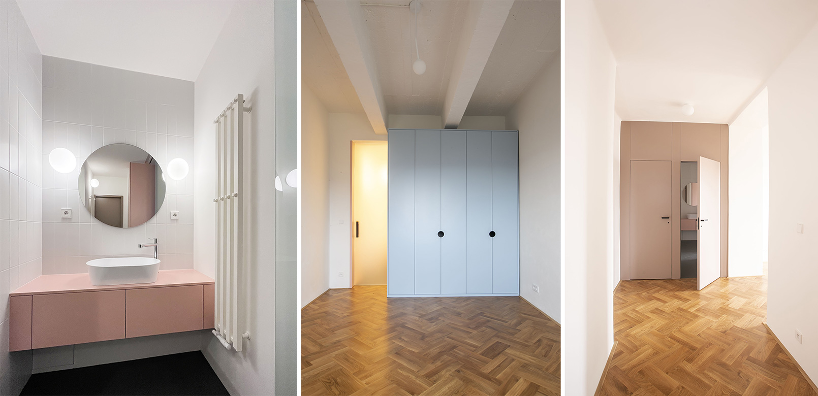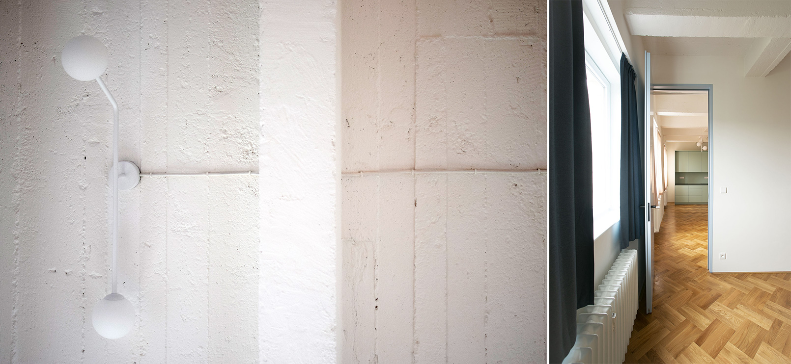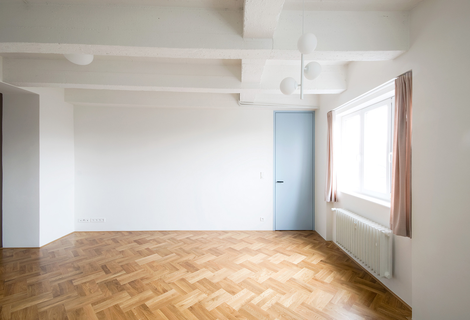 Původní chodbová dispozice, z níž byly jednotlivé pokoje přístupné, byla transformována do otevřeného konceptu 2+kk. Propojení pokojů s chodbou umožnilo lepší prosvětlení přirozeným světlem. K výraznému zlepšení a provzdušnění interiéru přispěl také sjednocený základ bílé výmalby, odstranění podhledů a otevření prostoru k železobetonové konstrukci trámového stropu. Interiér je doplněn světlou barevností truhlářských vestaveb laděných do jemných pastelových odstínů. Podlahové krytiny a vnitřní dveře byly nahrazeny novými, koupelna byla zvětšena a přímo propojena s chodbou i ložnicí, což zvýšilo uživatelský komfort.